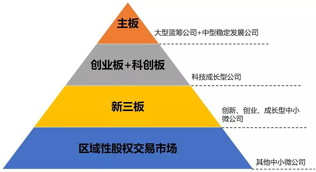 要说新三板,得要从我国的多层次资本市场说起。我国的资本市场可以大致分为一板、二板、三板、四板四个层次。前面的数字越小,对企业的各项指标的要求就越高。一板是指上交所和深交所的主板市场(今年4月深市主板已正式与中小板合并);二板包括创业板市场,也可以把新成立的科创板市场纳入二板概念;现在的三板指“新三板”,即全国中小企业股份转让系统;四板指区域性股权交易市场。