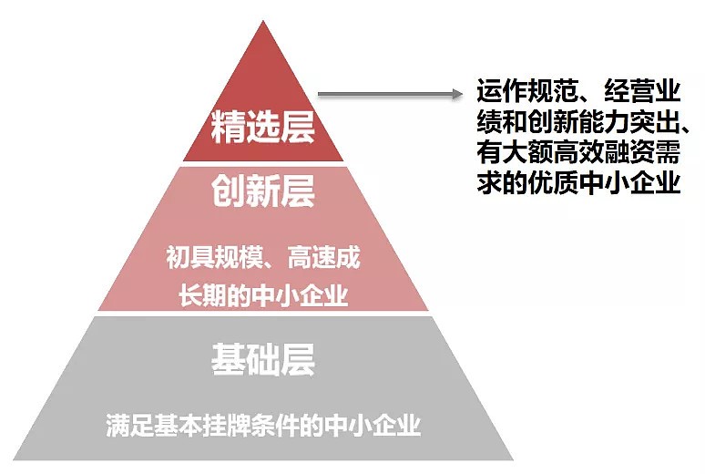 具体而言,目前新三板形成了“基础层-创新层-精选层”三个层次的市场结构,对企业的财务状况和公众化水平要求逐层提高,监管标准逐层趋严。目前精选层、创新层和基础层分别各有66家、1250家、5983家挂牌公司。