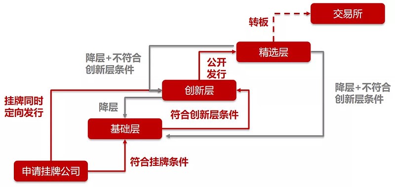 基础层的企业满足一定要求后可以申请进入创新层,挂牌满 12 个月的创新层挂牌公司,可以申请公开发行并进入精选层。根据去年发布的新三板转板制度,在精选层满一年且符合上市条件的企业可以直接申请转板至科创板/创业板上市。当然,对于不再符合相应层级条件的挂牌公司也会被适时“降层”调出。